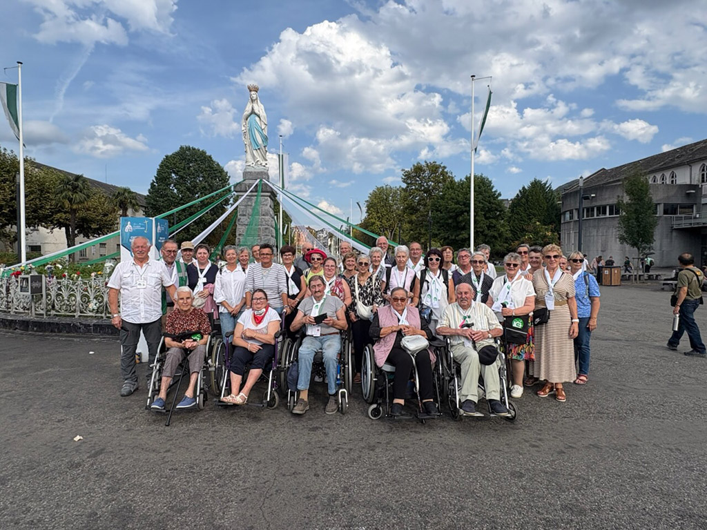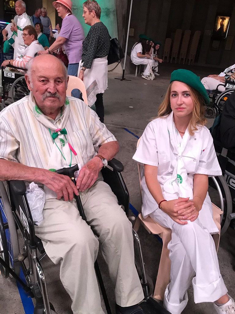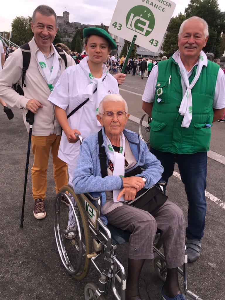 L’association Lourdes Cancer Espérance a vu le jour en 1985. C’était donc, cette année, le 40è anniversaire de ce mouvement devenu international. 7200 pèlerins se sont retrouvés dans un écrin vert et blanc pour fêter cet événement. Parmi eux, 52 personnes de notre diocèse, accompagnées de 15 jeunes filles du lycée Saint-Jacques-de-Compostelle du Puy-en-Velay. Quinze “anges” tout de blanc vêtu, au béret vert, pour accompagner, servir, s’occuper des pèlerins les plus fragiles de notre délégation ; tout cela dans la bonne humeur, la tendresse, le souci évident de remplir leur mission avec perfection.